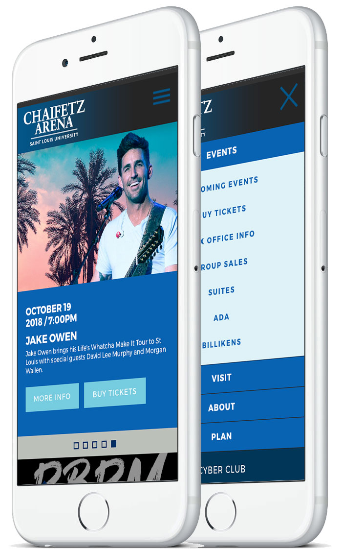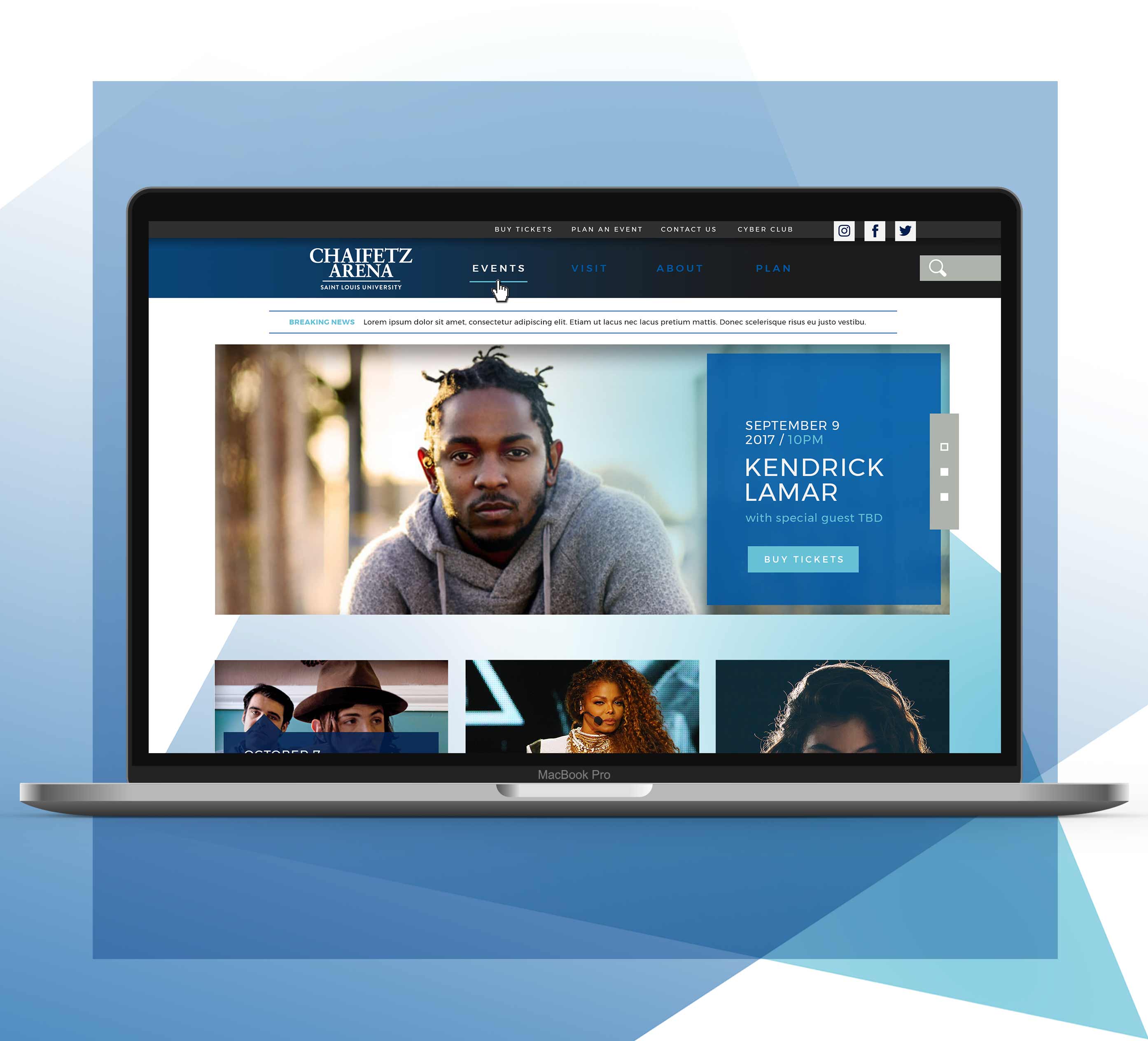 The Chaifetz Arena is the premier sports and entertainment arena in the midwest located on the campus of Saint Louis University. The venue has the ability to accommodate 10,000+ fans looking to experience exciting events from a top-tier university athletics program to the most popular musical acts. The highly visual web experience elevated the amenities, professional services, and event space. Branded with the university's colors as a staple, the boldness, standard, and tone are consistently displayed in every section of the website's appearance and messaging.